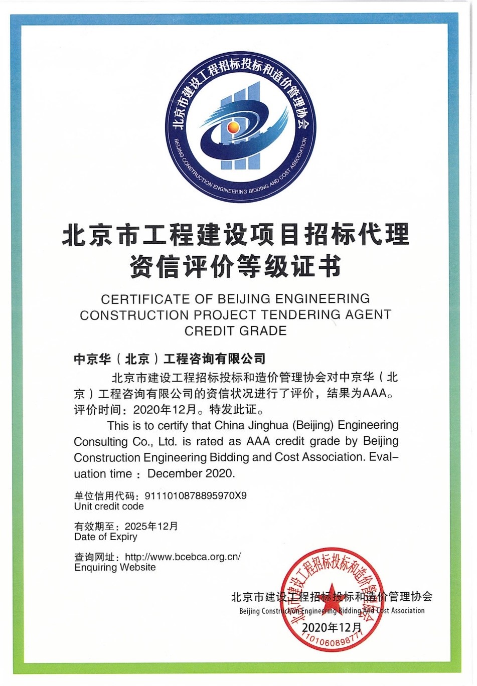 万象城平台荣获北京市招标代理企业3A资信评价等级证书